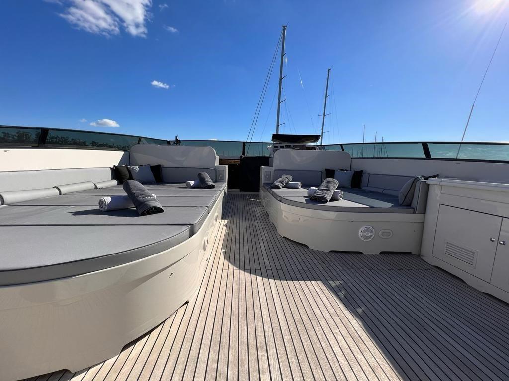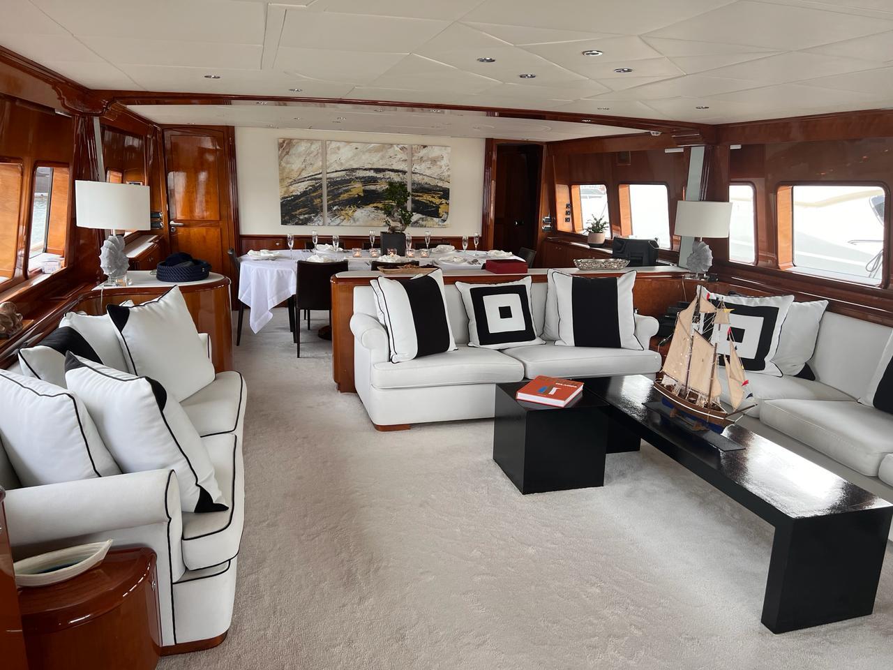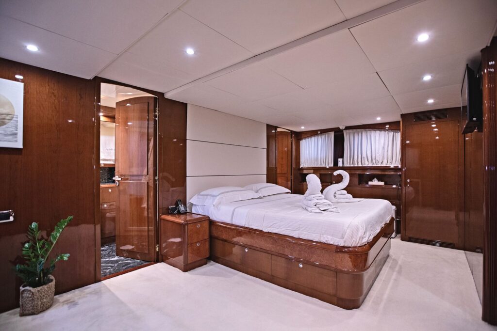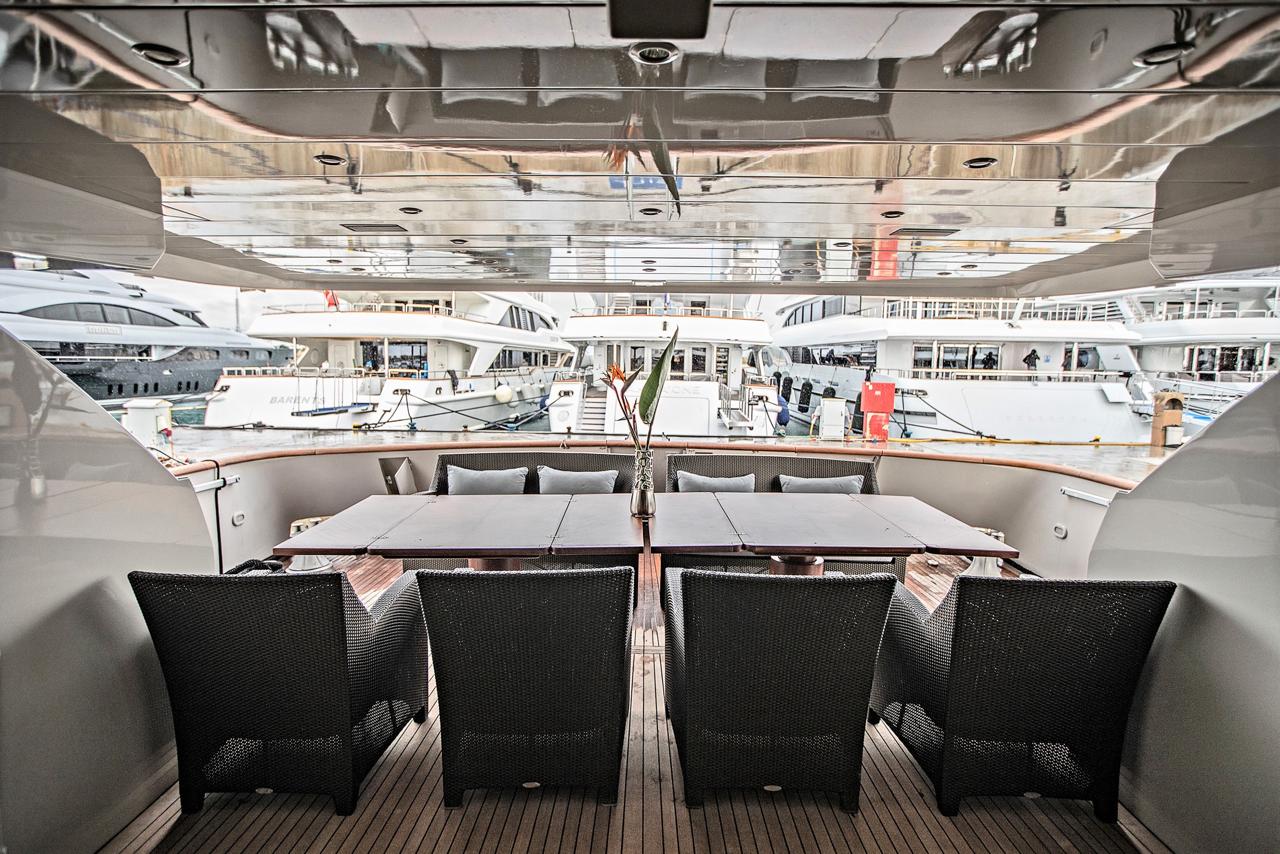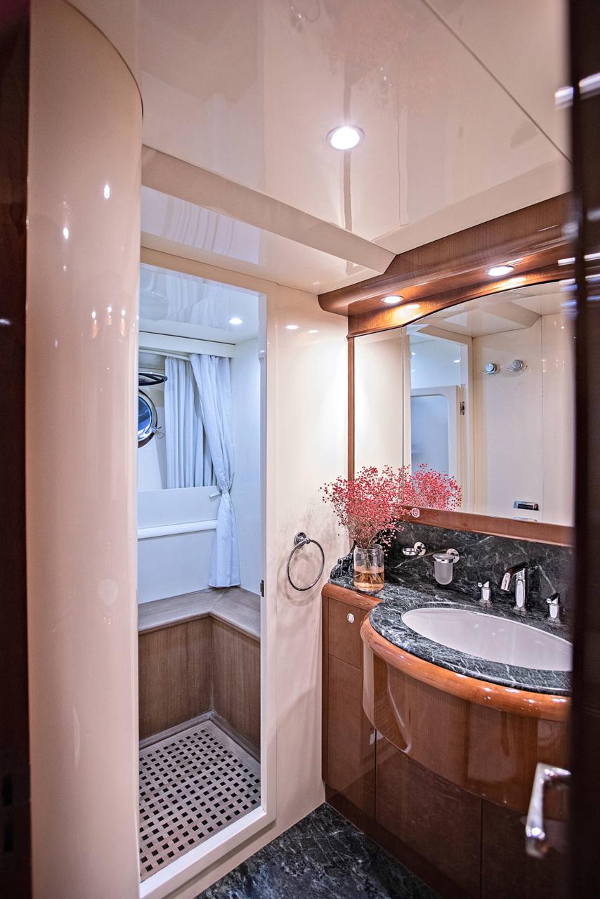 … is our wonderful Baglietto 101, with aluminum hull and superstructure that can accommodate up to 8-10 guests in her 4 cabins in the lower deck all with a/c and en suite facilities.