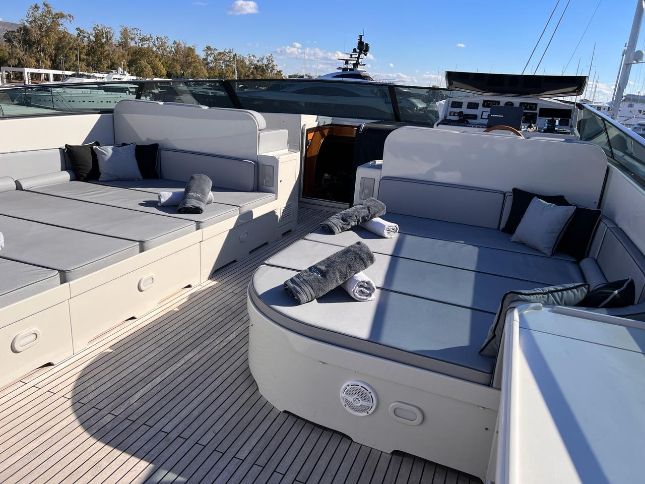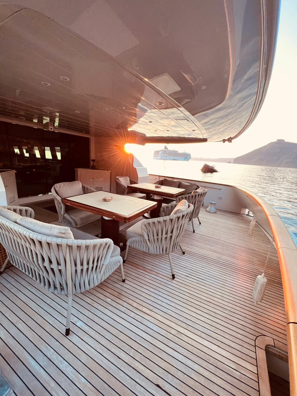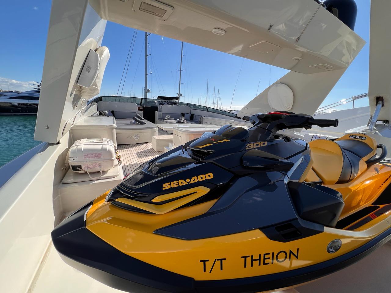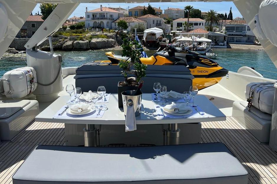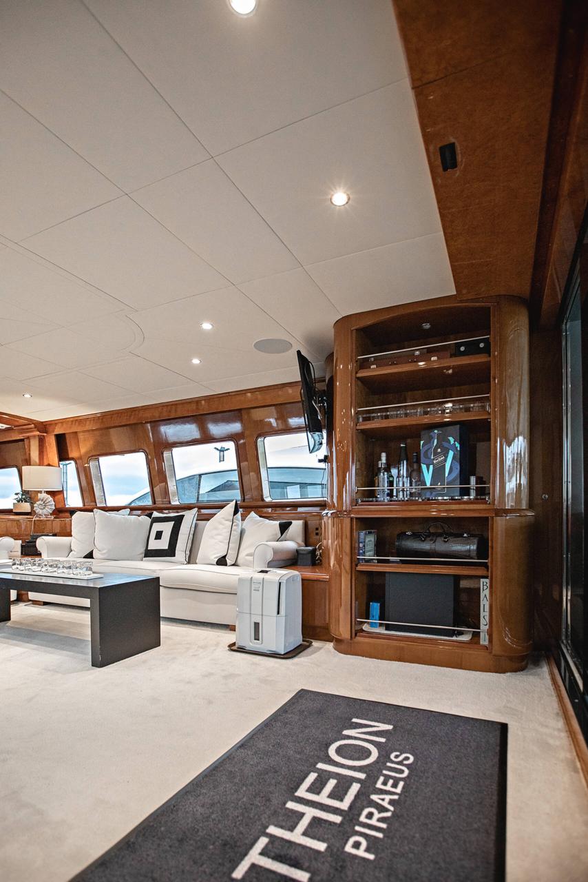 THEION’s interior is classic and elegant offering a sense of opulence when step on board. Her ample spaces along with her comfortable dining areas are ideal for gathering with family and friends. You can enjoy a fine dining experience either inside the yacht or at the aft deck, relax on the flybridge’s sunbathing area with a cocktail or, if you are more into adrenaline, have fun with her various water toys!
