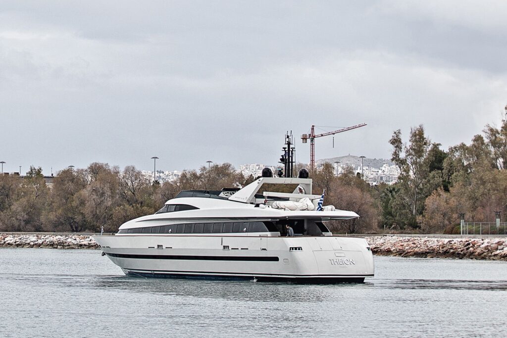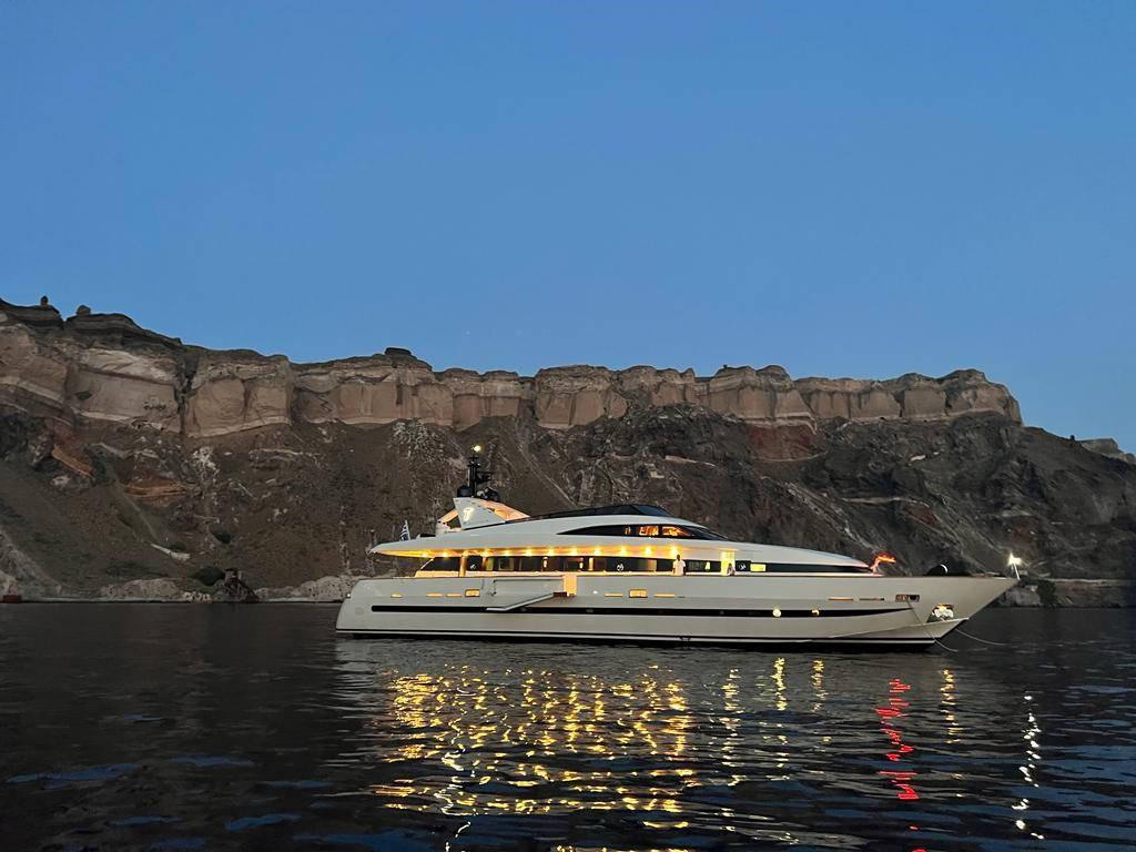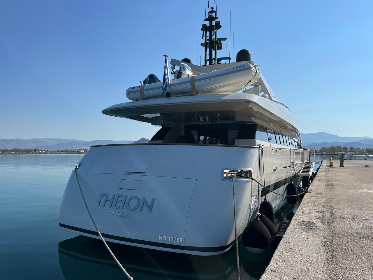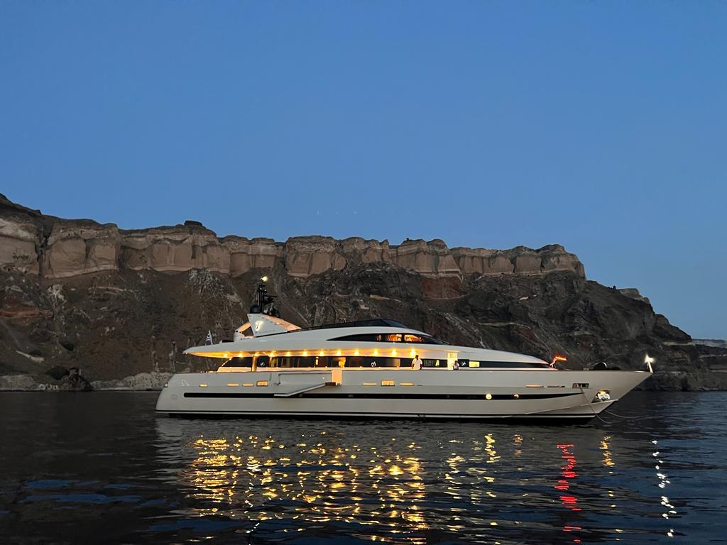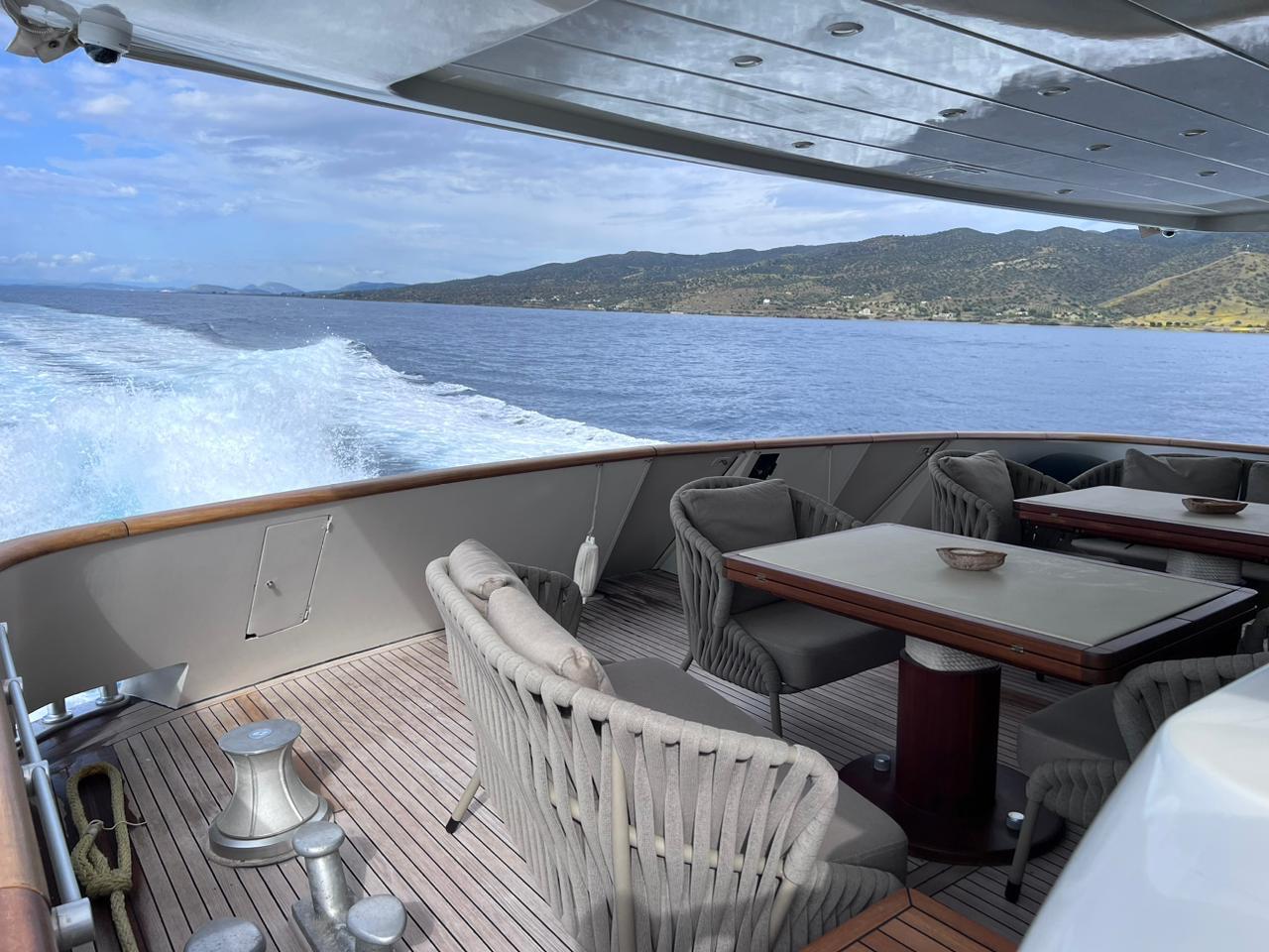 THEION is our wonderful Baglietto 101, with aluminum hull and superstructure that can accommodate up to 8-10 guests in her comfortable 4 cabins in the lower deck all with a/c and en suite facilities. One Master cabin, one VIP and two Twin that convert into perfect Double cabins with one Pullman berth in each, while her professional crew of 5 sleeps in separate compartments offering the maximum privacy to THEION’s guests. Her saloon and cabins are equipped with TV and audio system and so is her Flybridge for entertainment and fun! She is powered by 2 MTU engines that give her a cruising speed of 25 knots and a top of 32 knots so you can discover even more spots of the Greek coastline!