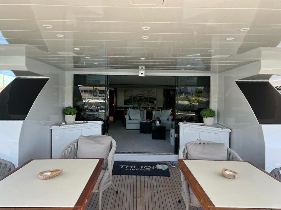 Sunpads, wifi, a/c, Sony MHC, V83D Bluetooth Audio system for parties, Sundeck is over than 100 sq.meters with refrigerator, Barbecue. THEION has also a sky lounge on the sundeck with clear view all around. The main deck has a good size galley, not visible to the guests and a comfortable saloon along with a very large dining area leading out to the cockpit.